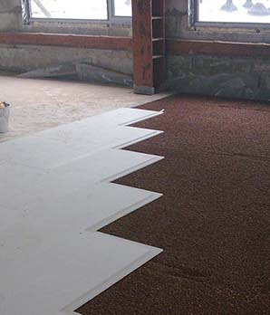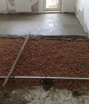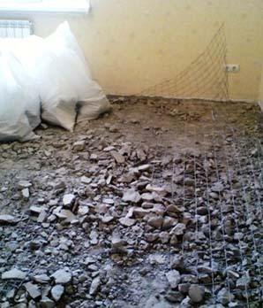 - При вязаном выравнивании пола заливка состава производится непосредственно на основание перекрытия, а сверху монтируется гидроизоляция и декоративное покрытие. Чаще всего этот метод используется при выравнивании высоты пола в квартирах новостроек.